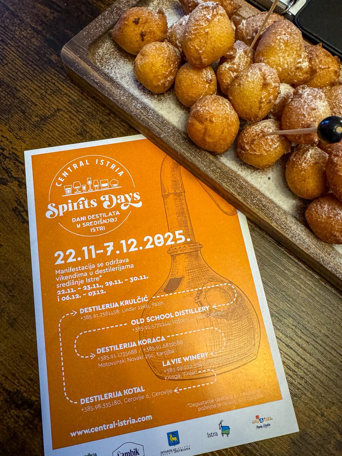 Ova je manifestacija posvećena promociji rakija, likera i destilata, alkoholnim pićima dobivenima destilacijom fermentiranog voća ili bilja po kojima je Istra poznata zbog bogate tradicije, blage klime i raznolikog bilja koje ovdje raste. Posjetitelji će imati priliku uživati u besplatnim degustacijama, a manifestacija će biti održana tijekom tri vikenda, s početkom 22. studenog 2025. godine i zaključno s 7. prosincem. Program će trajati od 13:00 do 19:00 sati, a u njoj će sudjelovati proizvođači destilata s područja središnje Istre – Destilerija Krulčić (Lindar), La Vie