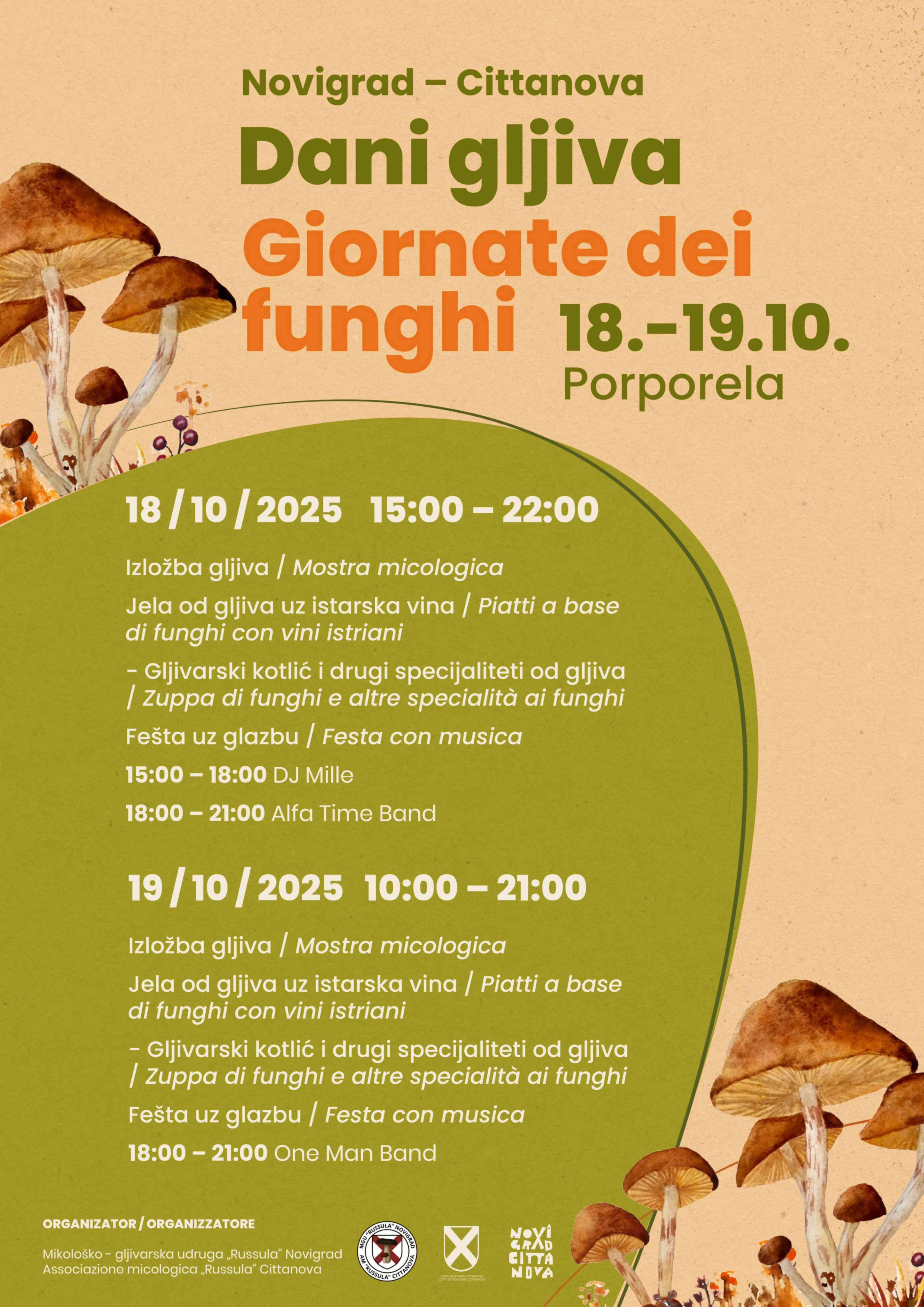 Na Porporeli se u subotu (od 15 do 22 sata) i nedjelju (od 10 do 21 sat) održavaju Dani gljiva, u organizaciji Mikološko-gljivarske udruge “Russula” Novigrad. Posjetitelje očekuje impresivna izložba gljiva te bogata gastro ponuda uz opuštenu atmosferu pod šatorom. Uz neizostavni gljivarski kotlić, u ponudi će biti razni specijaliteti od gljiva po promotivnoj cijeni - gljive s roštilja, fuži i rižoto od gljiva, salata od lisičarki, pašteta te palačinke od gljiva. Za dobar ritam vikenda pobrinut će se DJ Mille i Alfa Time Band u subotu te One Man Band u nedjelju navečer.