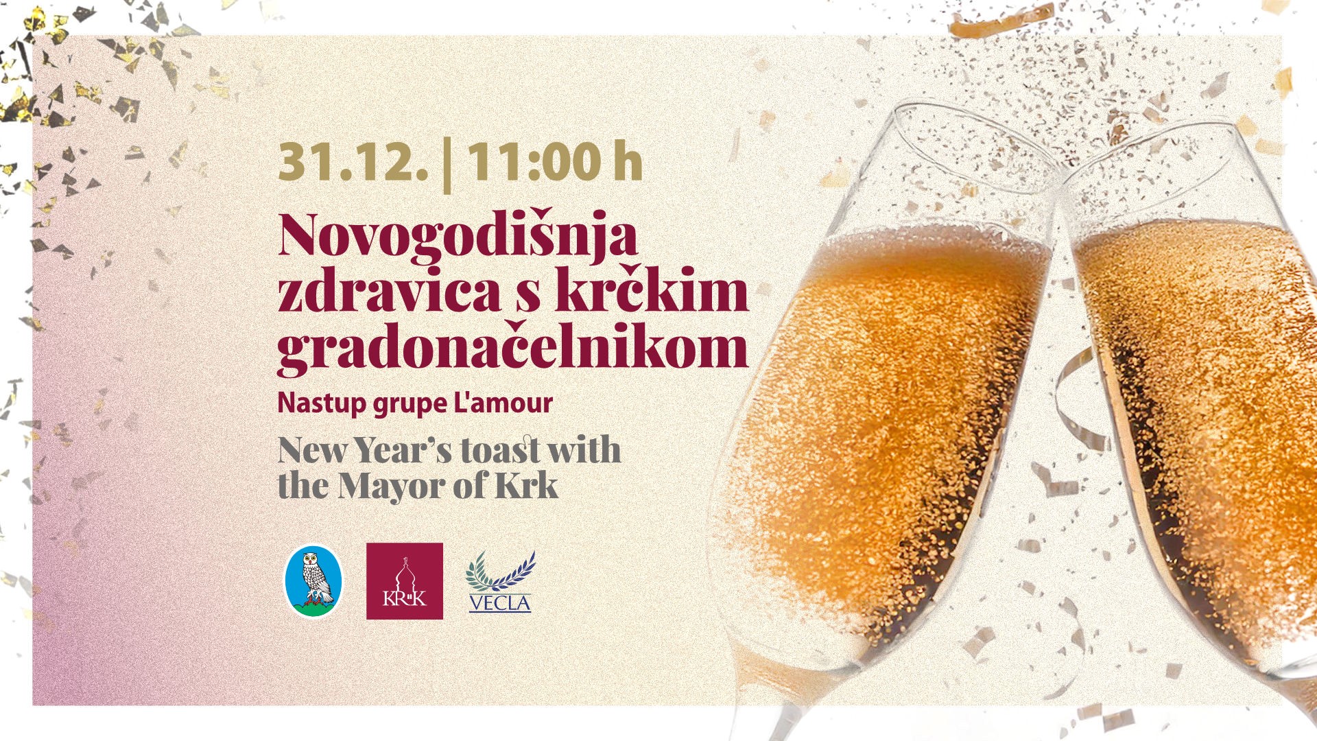Staru ćemo godinu, pred polukupolom kod Velikog parka (ispod koprivića), ispratiti točno u podne uz tradicionalnu novogodišnju zdravicu krčkog gradonačelnika. Za zabavni glazbeni program pobrinut će se popularna grupa L’amour, koja će i ove godine osigurati odličnu atmosferu za zajedničko druženje i slavlje. Posebno za ovu prigodu, podijelit ćemo čak tisuću čaša vrhunskih krčkih pjenušaca!