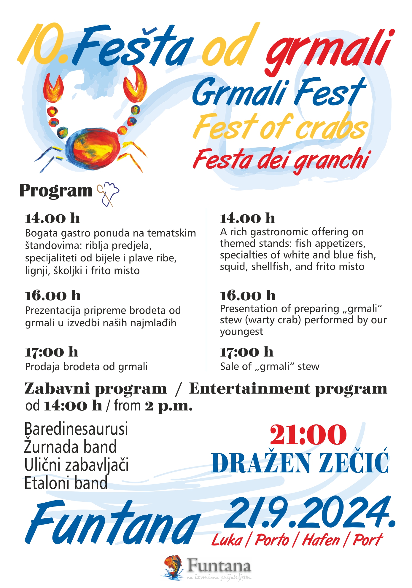 Turistička zajednica općine Funtane s ponosom vas poziva na tradicionalnu 10. Feštu od grmali, koja će se održati u subotu, 21. rujna, na rivi u Funtani. Ova popularna manifestacija poznata je po vrhunskoj gastronomskoj ponudi i odličnom glazbenom programu, a ove godine obećava nezaboravno iskustvo za sve posjetitelje! Fešta je to boja, mirisa i okusa, prava proslava pučke ribarske kuhinje našeg istarskog poluotoka. Iako grmal ili grmalj, poznat i kao granci-povero, što znači "rak siromah", nekad nije imao visoku vrijednost, danas je prava morska delicija.