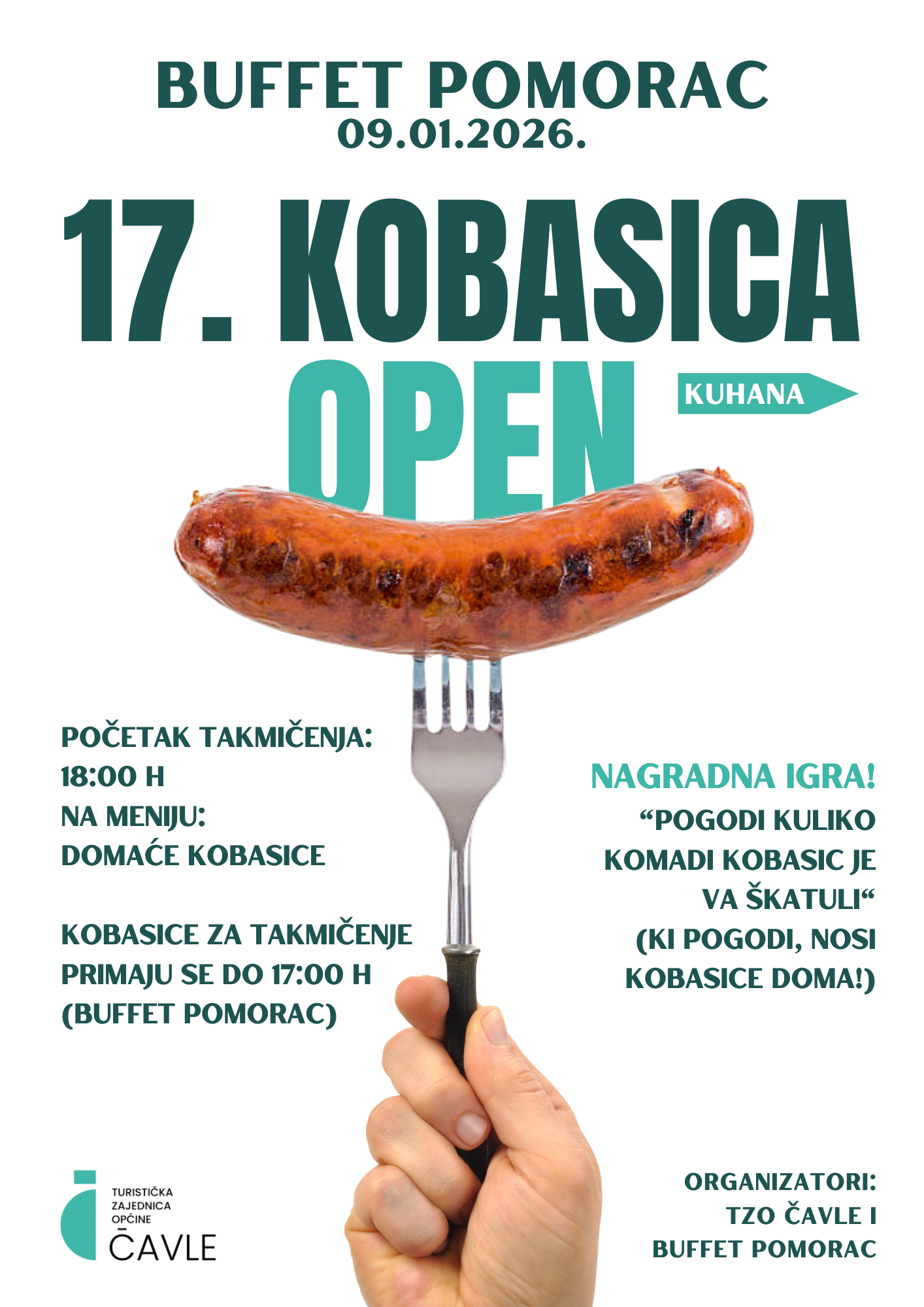 U petak, 9. siječnja, u organizaciji Turističke zajednice općine Čavle i Buffeta Pomorac, održava se 17. Kobasica Open. Natjecanje započinje u 18 sati, dok se kobasice za ocjenjivanje zaprimaju do 17 sati u Buffetu Pomorac. Očekuje vas večer ispunjena ukusima, mirisima i dobrom zabavom koja grije i najhladnije siječanjske dane.
