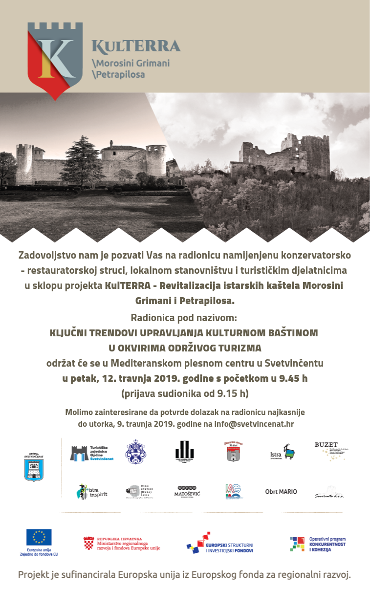 PROGRAM RADIONICE ZA KONZERVATORSKO – RESTAURATORSKU STRUKU, LOKALNO STANOVNIŠTVO I TURISTIČKE DJELATNIKE: „KLJUČNI TRENDOVI UPRAVLJANJA KULTURNOM BAŠTINOM U OKVIRIMA ODRŽIVOG TURIZMA“ u Mediteranskom plesnom centru u Svetvinčentu u sklopu Integriranog razvojnog programa KulTERRA – Revitalizacija istarskih kaštela Morosini-Grimani i Petrapilosa
