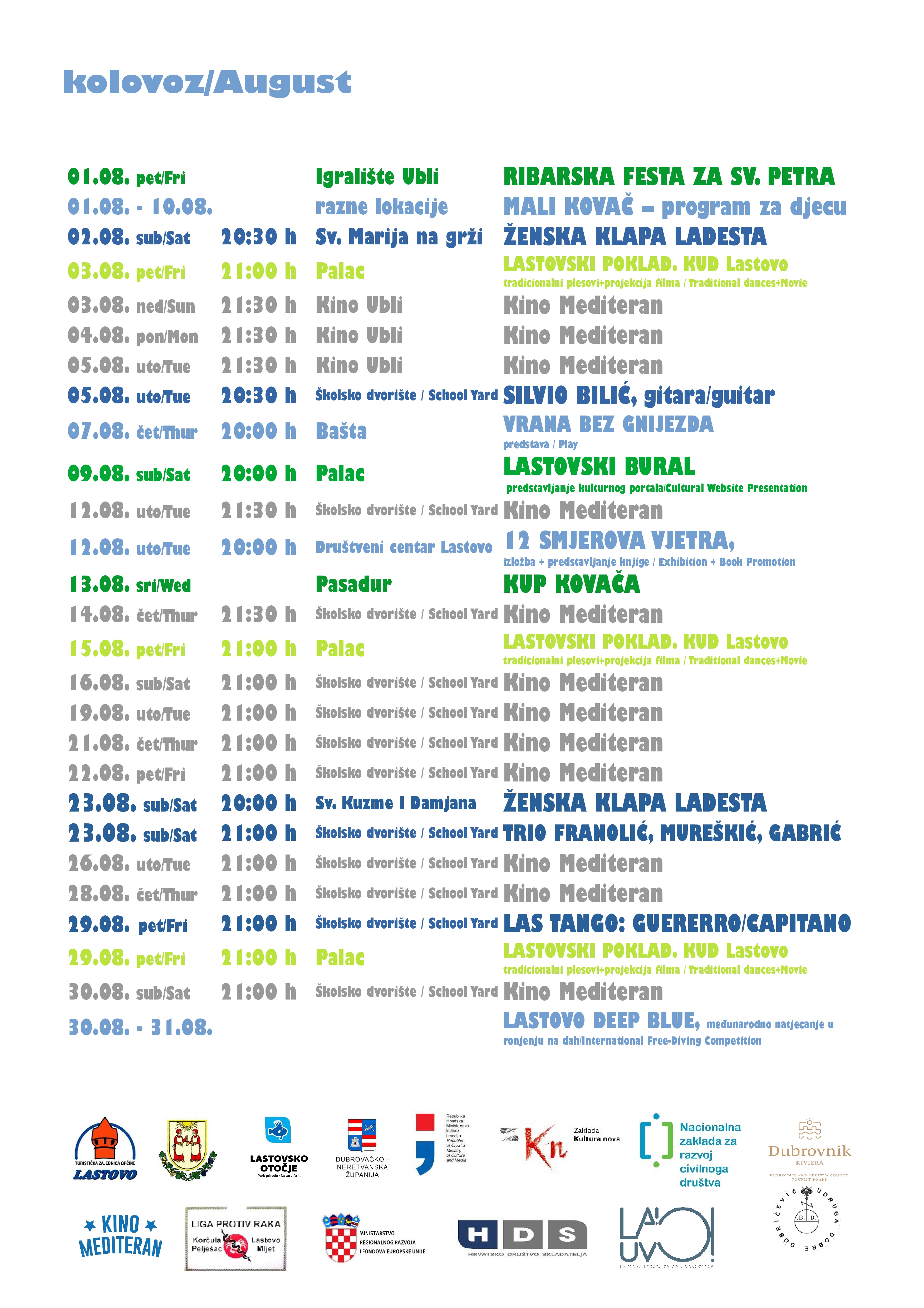 1. kolovoza, Park prirode “Lastovsko otočje” sprema Ribarsku festu za sv. Petra, a u njihovoj će se režiji po treći odigrati i “Kup kovača”, natjecanje u starim sportovima koje je inspiriralo i dječji program “Mali kovač” koji nam donose Dobre vile kroz 6 sportskih i likovnih radionica od 01. do 10. kolovoza. Netom prije, od 26. srpnja, počinju i STEM i Lego radionice udruge Dobre Dobričević, 07. kolovoza je predstava “Vrana bez gnijezda”, tako da lokalna i gostujuća djeca na otoku imaju dva tjedna programa u kontinuitetu.