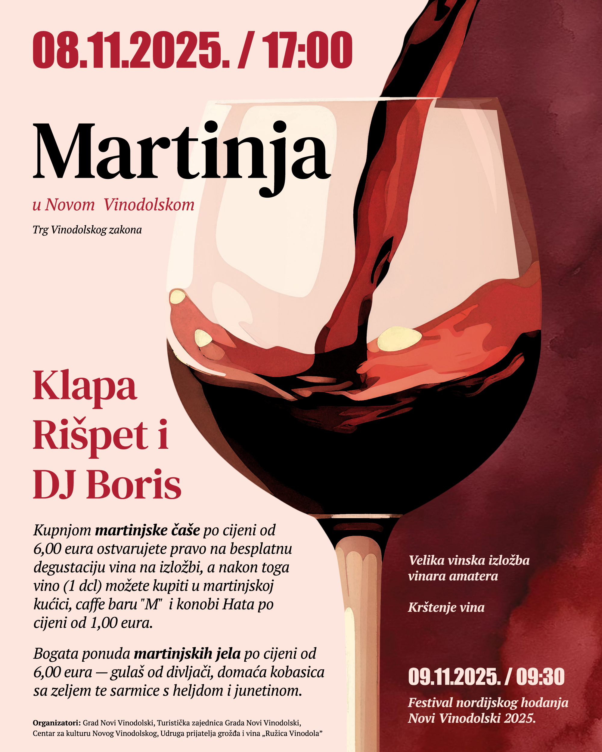 Novi Vinodolski, grad bogate povijesti, kulturnog nasljeđa i prirodnih ljepota, ali i grad koji s ponosom njeguje kulturu vinarstva i vinogradarstva – grad žlahtine – ove godine priprema Martinjsku proslavu u potpuno novom izdanju. Kako i samo ime grada govori o njegovim bogatim vinskim korijenima, Martinje će ove godine biti prilika da se pokaže koliko Novi Vinodolski živi i diše s vinom uz pregršt dobrog vina, miris ukusne hrane i dobrog raspoloženja.