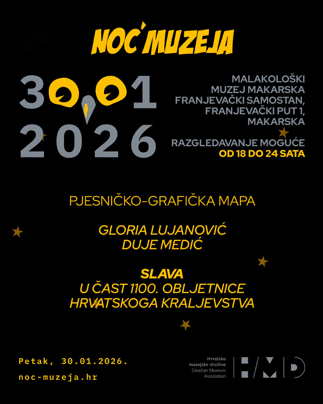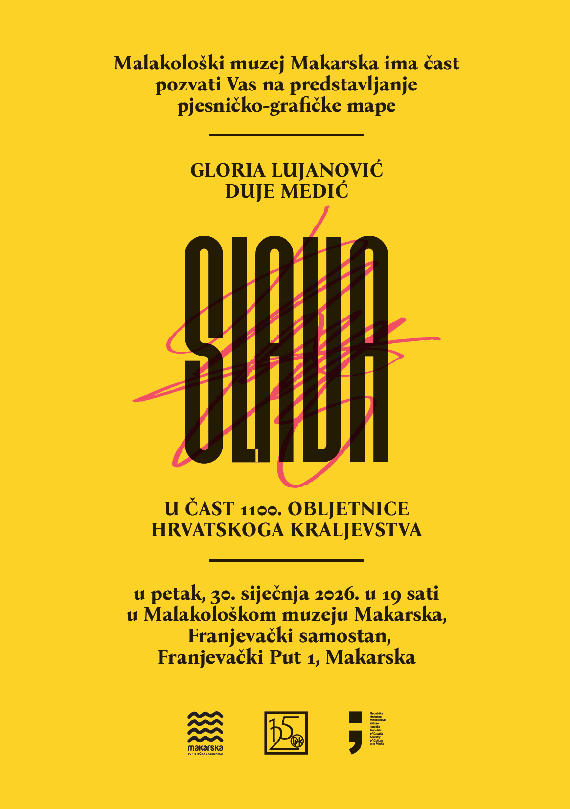 U 19 sati bit će otvorena izložba Pjesničko grafičke mape „Slava“, nastale u čast 1100. obljetnice hrvatskoga kraljevstva. Autori mape su akademski slikar i grafičar Duje Medić, rodom iz Brela, te književnica Gloria Lujanović, autorica poeme koja čini tekstualni dio ovog izdanja.
