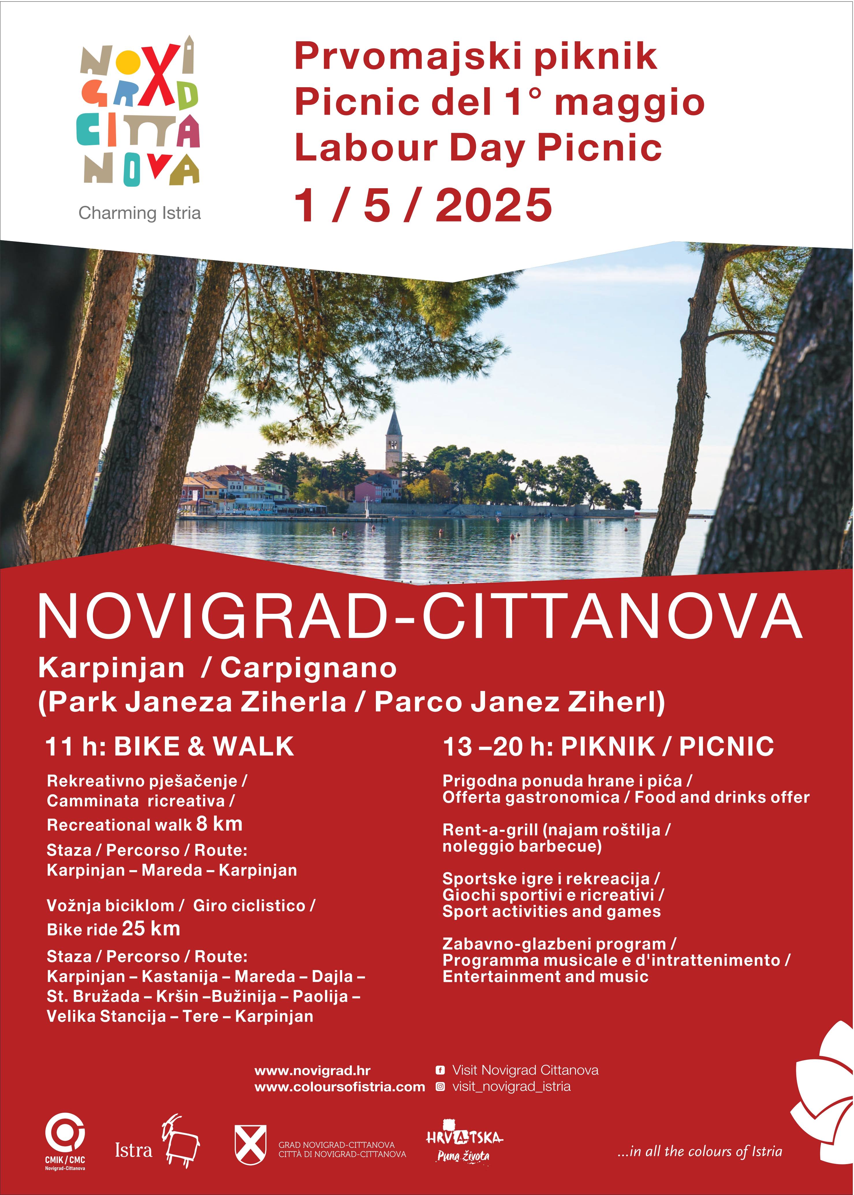 Novigrad - Cittanova poziva sve Novigrađane i goste grada da Praznik rada proslave druženjem, sportom, dobrom hranom i pićem, smijehom i pjesmom u Karpinjanu, u zelenili i hladu Parka Janeza Ziherla s pogledom na povijesni centar grada.