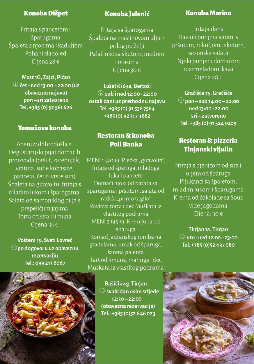 Tomažova konoba: Aperitiv dobrodošlice / Degustacijski pijat domaćih proizvoda (Istarski pršut, zarebnjak, vratina, suhe kobasice, panceta, četiri vrste sira) / Špaleta na giravoltu, fritaja s mladim lukom i šparogama, Salata od samoniklog bilja s prepeličjim jajima / Torta od sira i limuna / Cijena 35€