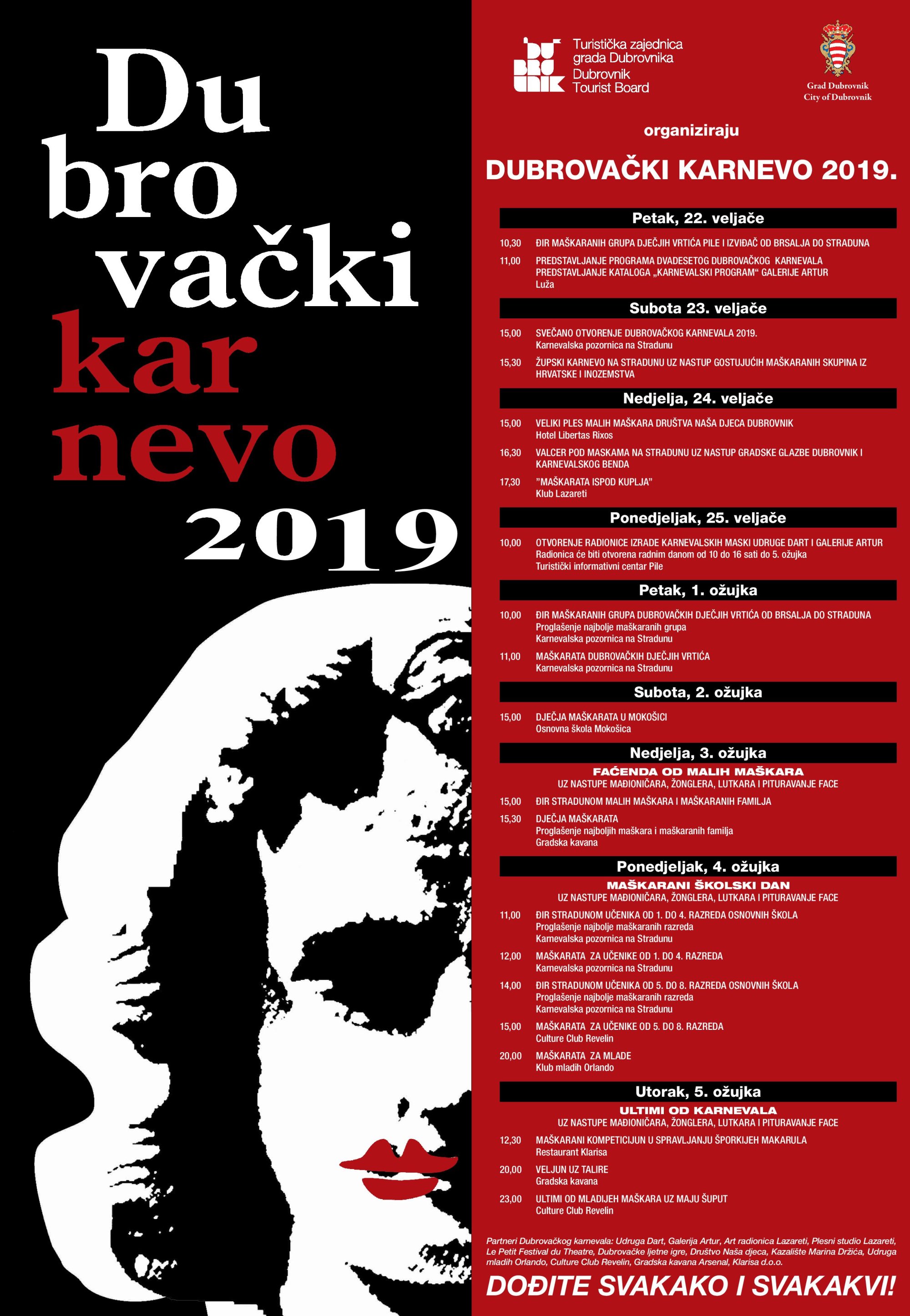 Jubilarni, 20. Dubrovački karnevo u organizaciji Grada Dubrovnika i Turističke zajednice grada Dubrovnika, koji ove godine traje od 22. veljače do 5. ožujka, započinje đirom maškaranih grupa dječjih vrtića Pile i Izviđač od Brsalja do Straduna, u petak, 22. veljače u 10:30 sati,, nakon čega slijedi predstavljanje bogatog programa Karnevala u Luži u 11:00 sati.