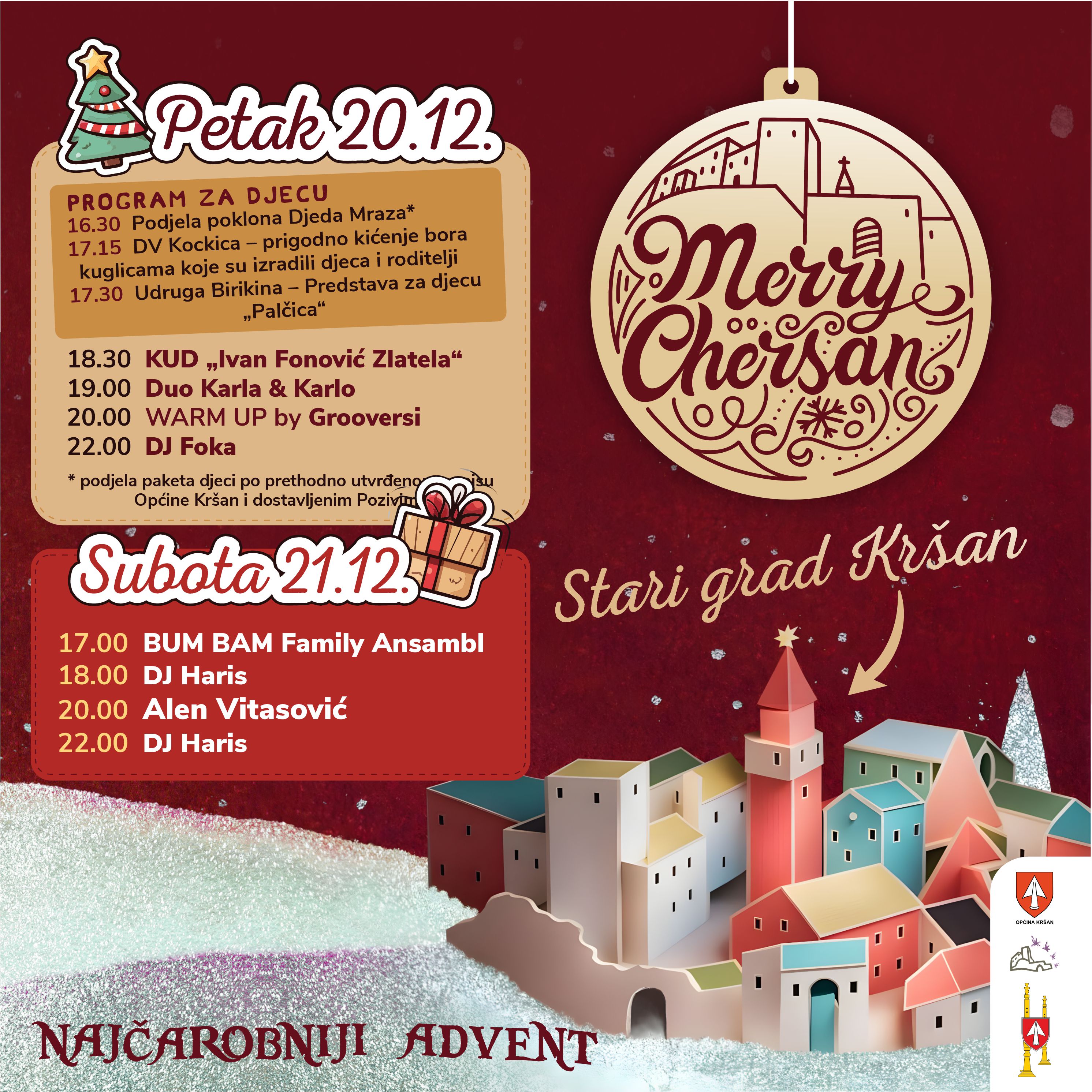 Otvorenje programa u petak, 20. prosinca, u 16.30 sati pripast će, naravno, Djedu Mrazu, koji će podijeliti poklone kršanskim mališanima, nakon čega će roditelji pripomoći u kićenju bora ukrasima koji su izradili s djecom. Uslijedit će dječja predstava „Palčica“ u izvedbi udruge Birikina, nastup KUD-a „Ivan Fonović Zlatela“ Kršan, te talentirane pjevačice, harmonikašice i pijanistice Karle Levak iz Kožljaka sa Karlom . Od 20 sati nastupit će popularni Grooversi, a zabavu će u noć potegnuti DJ FOKA.