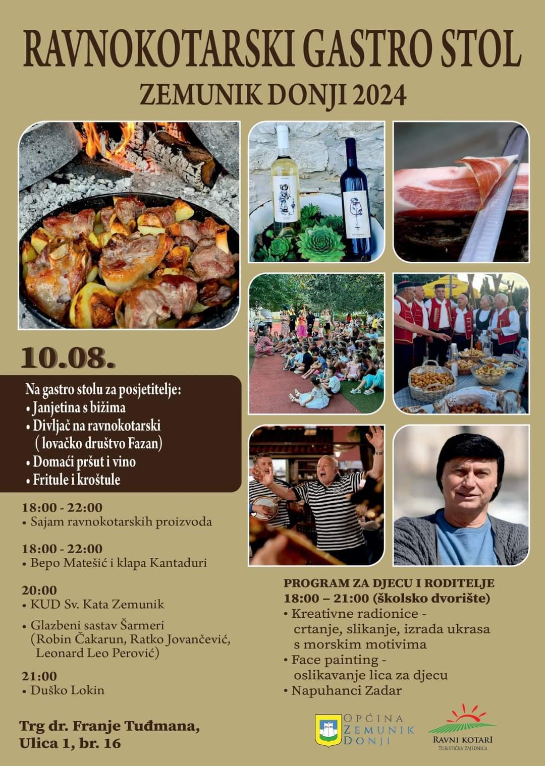RAVNOKOTARSKI GASTRO STOL u organizaciji Općine Zemunik Donji i Turističke zajednice Ravni kotari koja će se održati u subotu 10.08.2024. s početkom u 18:00 sati na Trgu dr. Franje Tuđmana u Zemuniku Donjem.