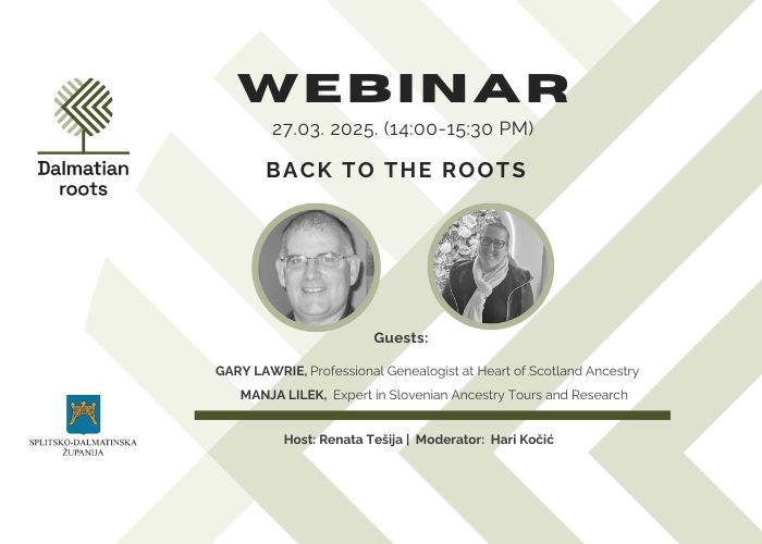 Pozivamo vas da se pridružite webinaru „Povratak korijenima“, koji će se održati 27. ožujka 2025. godine od 14:00 do 15:30 CET putem platforme Google Meet na engleskom jeziku. Organizator webinara je Upravni odjel za turizam, pomorstvo i promet Splitsko-dalmatinske županije, u okviru projekta „Povratak korijenima“.