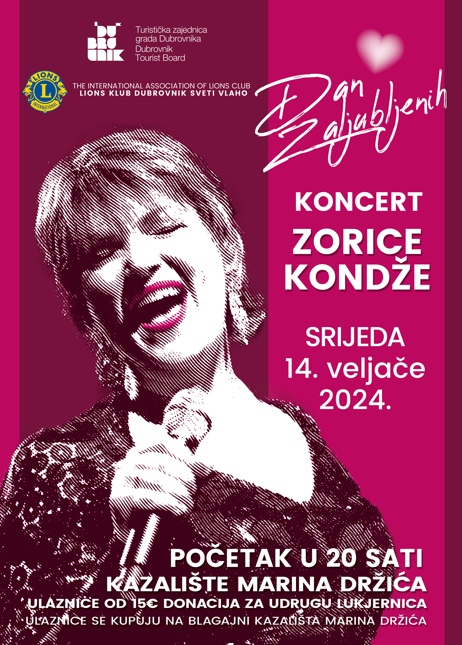 Turistička zajednica Grada Dubrovnika i Lions klub sv. Vlaho pozivaju na koncert dive hrvatske estrade Zorice Kondža koji će se održati u Kazalištu Marina Držića na Valentinovo, 14. veljače s početkom u 20 sati. Ulaznice od 15 eura su donacija za Udrugu Lukjernica koja brine o zaštiti prava psihijatrijskih pacijenata i unaprjeđenje duševnog zdravlja i kvalitete života. Ulaznice se kupuju na blagajni Kazališta Marina Držića. Pozivamo sve posjetitelje da podrže humanitarnu akciju kako bismo pomogli, stvorili nezaboravno iskustvo i učinili Valentinovo još posebnijim.