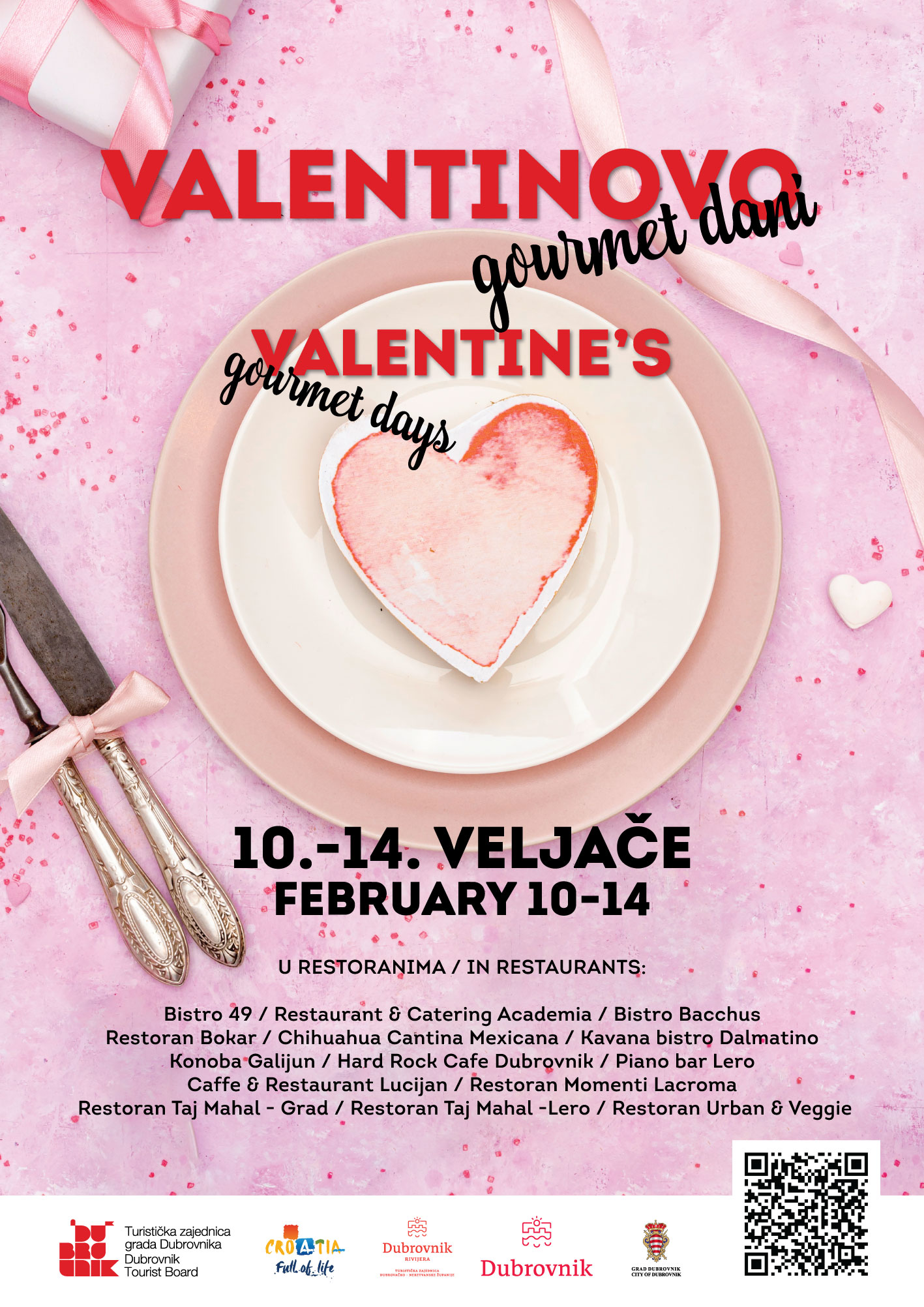 Turistička zajednica grada Dubrovnika već tradicionalno organizira Valentinovo Gourmet Dane, od 10. do 14. veljače, u četrnaest dubrovačkih restorana, koji su pripremili posebne i maštovite menije kako bi Dubrovčani i njihovi gosti mogli uživati u gastronomskim delicijama tijekom Valentinova. Od tradicionalnih domaćih specijaliteta do internacionalnih kulinarskih iznenađenja, pozivamo svih da uživaju u jedinstvenim okusima i ambijentu. Brošuru s prigodnim menijima prelistajte na sljedećem linku: Brošura Valentinovo Gourmet Dani.