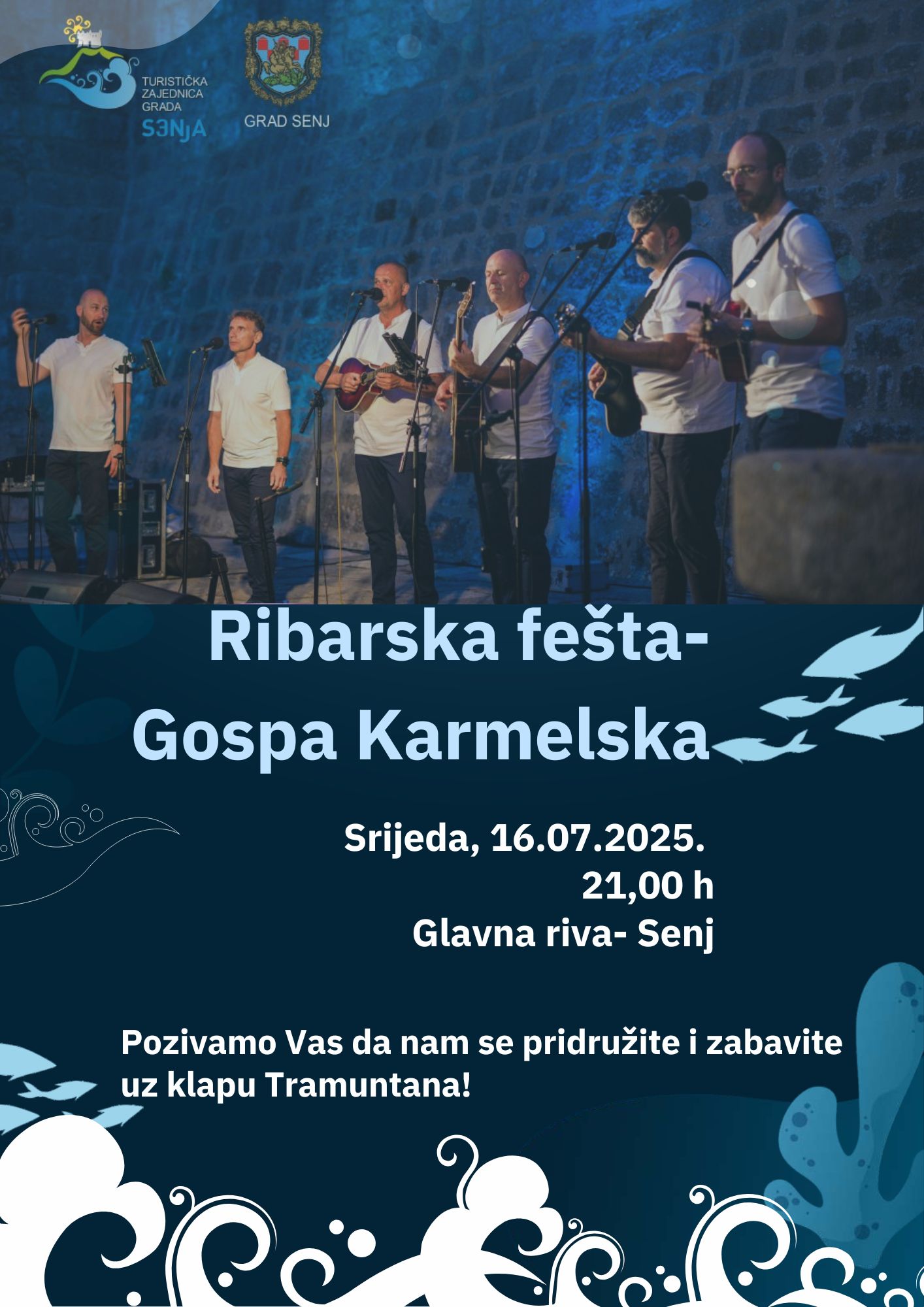 U povodu obilježavanja blagdana Gospe Karmelske (Ribarske) Turistička zajednica Grada Senja organizira u srijedu 16. srpnja 2025. ribarsku feštu koja će se održati na Gatu svetog Nikole (Glavna riva) u Senju s početkom u 21:00 sat.