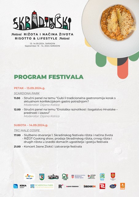 Zvijezda kulinarskog programa svakako je čuveni skradinski rižot koji će uz prigodan kulturno – umjetnički i glazbeni program te sajam vinara i gostiju Festivala, biti glavni pokretač događanja tijekom petka. Gastronomsku ponudu obogatit će i vrsni kuhari iz raznih dijelova Hrvatske koji će u subotu, 14. rujna u večernjim satima okupirati Trg Male Gospe. RIŽOT Cooking show okupit će iskusne chefove koji će pripremati originalne rižote i varijacije istih; od Istre i mirisa tartufa do dalmatinskih specijaliteta i mirisa žižula. Skradinski festival rižota i načina života u večernjim satima subote završit će koncertom hrvatske glazbene dive Jasne Zlokić (21h).