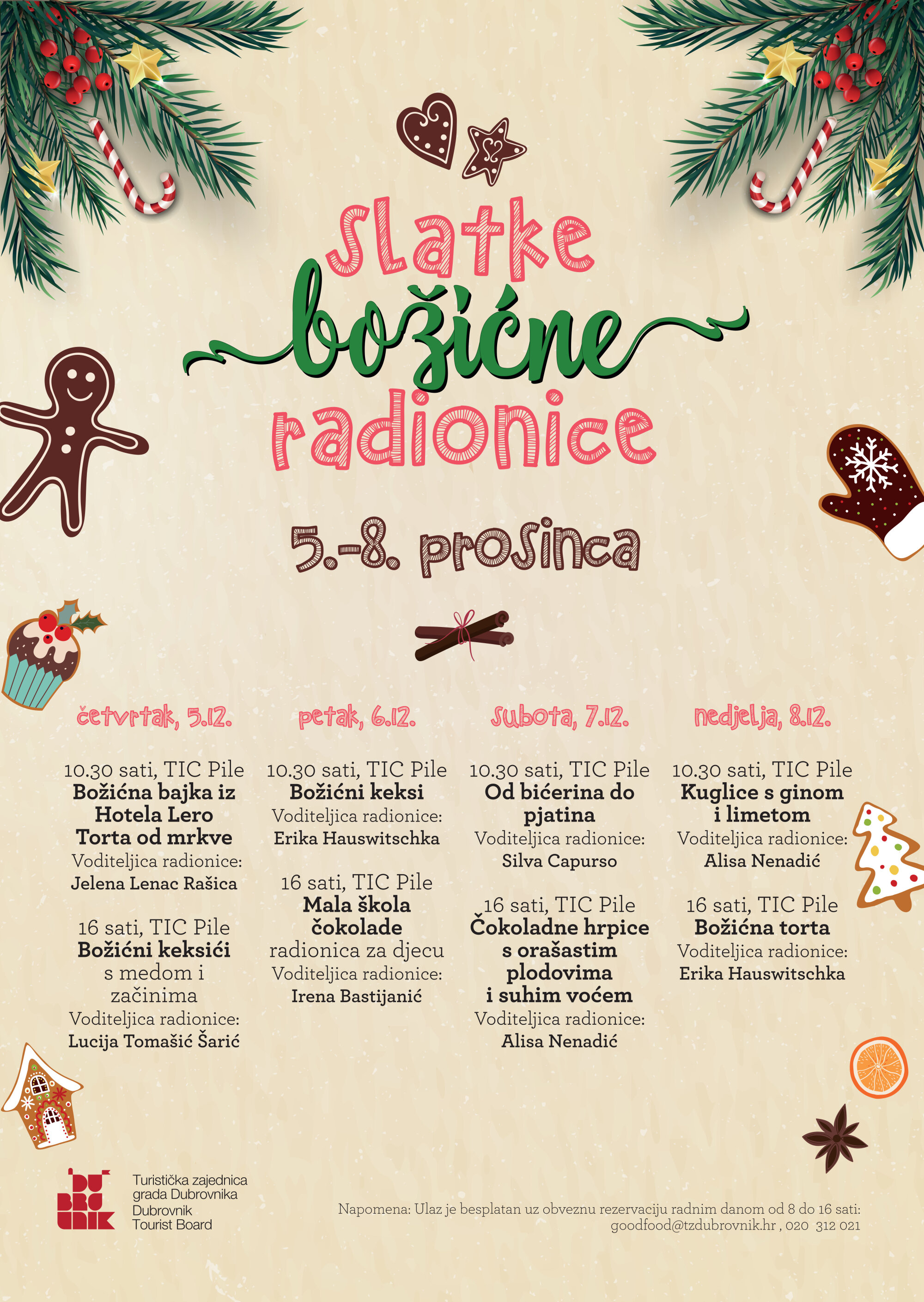 Za početak Dubrovačkog zimskog festivala Turistička zajednica grada Dubrovnika pripremila je Slatke Božićne radionice, koje će se od četvrtka, 5. do nedjelje, 8. prosinca održavati u TIC-u na Pilama za sve sladokusce i sve koji žele naučiti pripremati neke nove slastice.