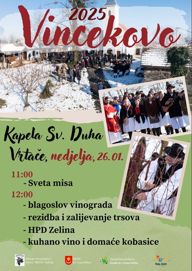 Domaćini ovogodišnjeg obilježavanja Vincekova, Udruga vinara i vinogradara Brina iz Kalinja, uz suorganizatore Grad Sveti Ivan Zelina i Turističku zajednicu grada Svetog Ivana Zeline, poručuju: „Dođite, uživajte u čarima vinogradarske tradicije i započnite novu godinu u dobrom društvu!“