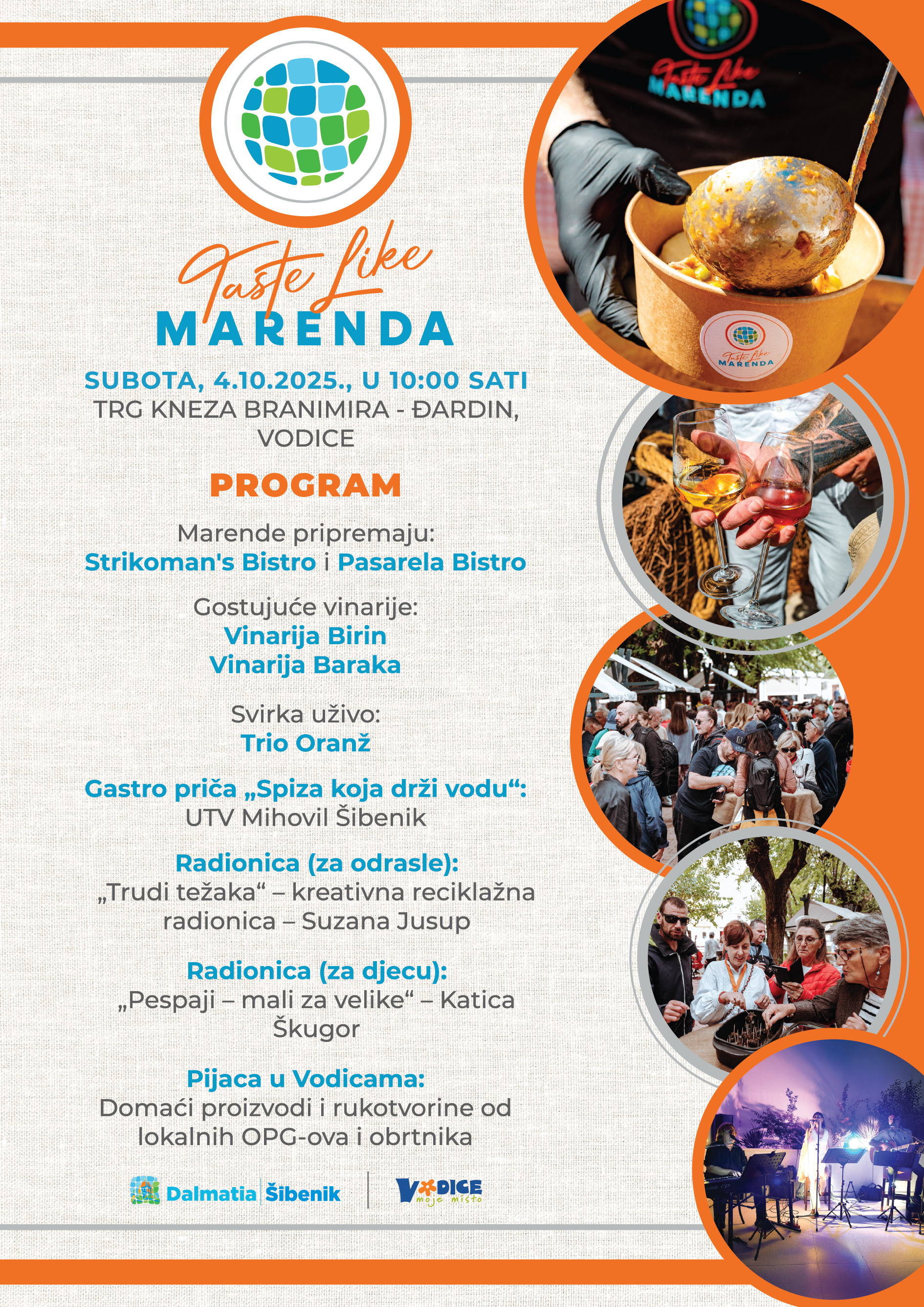 Prva subota u mjesecu rezervirana je za marendu, a ovogodišnji projekt „Taste like... marenda“ zatvaramo u Vodicama. Ukusnu, tradicionalnu spizu u Đardinu pripremat će Strikoman's Bistro i Pasarela Bistro, a vinsku ponudu donose vinarije Birin i Baraka. Program započinje edukativnom gastro pričom "Spiza koja drži vodu", koju će na autentičan način ispričati predstavnice UTV Mihovil Šibenik, dok će za glazbenu kulisu biti zadužen Trio Oranž. Očekuju vas i zanimljive tematske radionice za djecu i odrasle te sajam lokalnih proizvoda i rukotvorina.