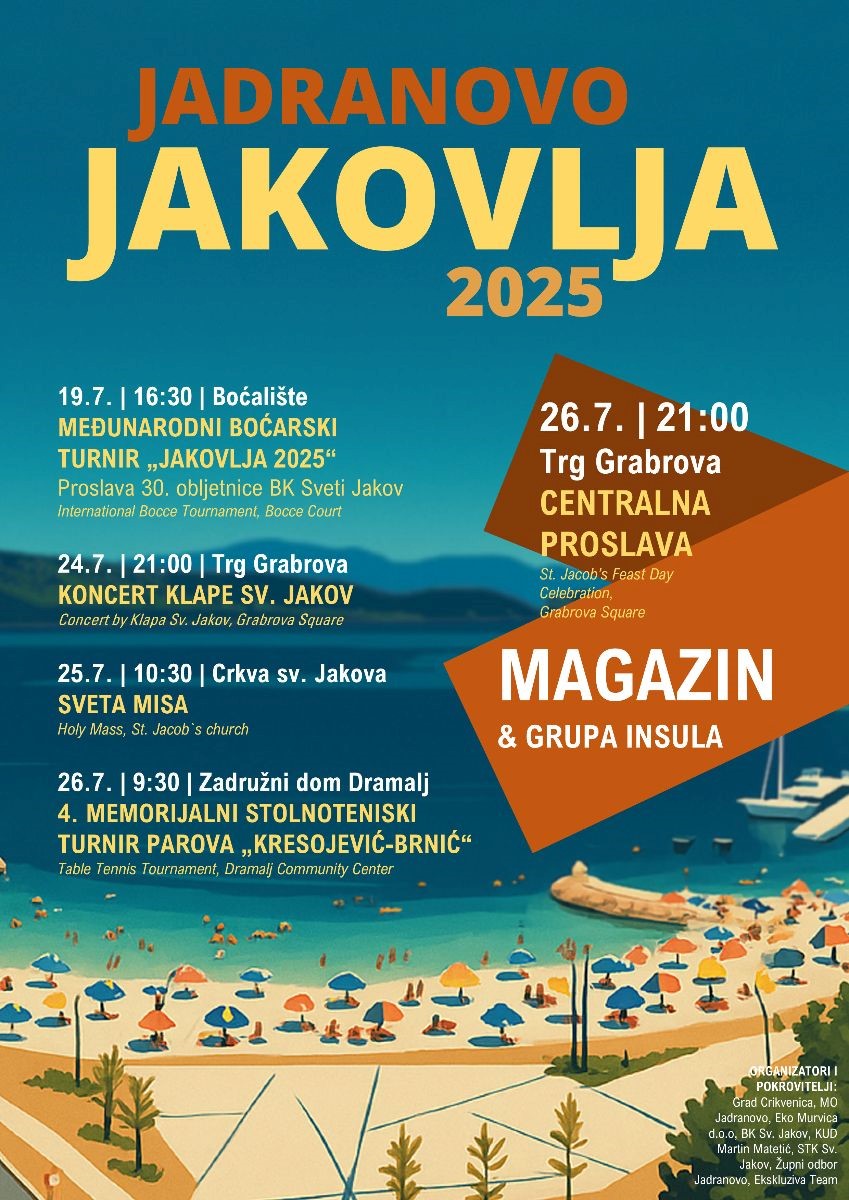 Malo primorsko mjesto Jadranovo svake godine s radošću slavi svoga zaštitnika, svetoga Jakova. Jakovlja je ispunjena programom zabavnog, kulturnog, sportskog i vjerskog karaktera. Glazbene večeri, tradicionalni boćarski turnir i primamljiva gastronomska ponuda samo su dio onoga što vas očekuje. Program je počeo boćarskim turnirom, a u nastavku je sadržaj koji vas očekuje: