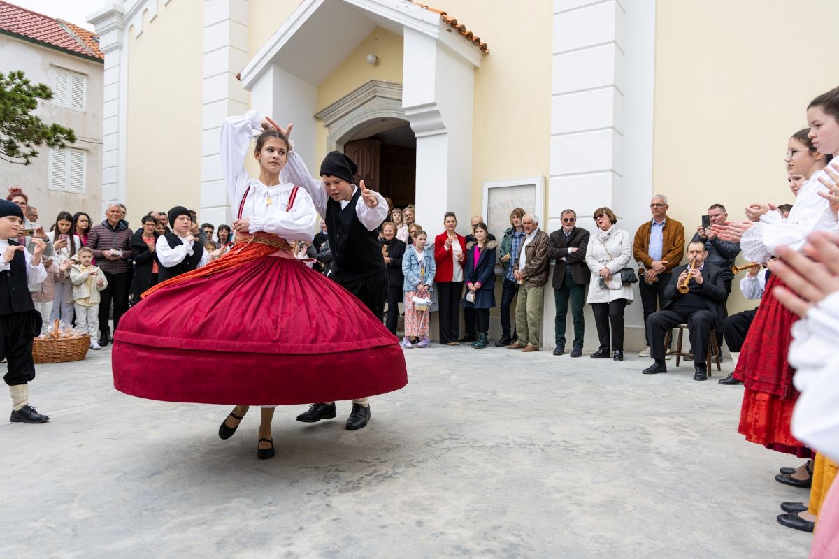 Uskrsna nedjelja, 5. travnja, donosi mirniji, svečaniji ton. Dan započinje svetom misom u 10:30 sati u župnoj crkvi Presvetog Trojstva, prostoru koji svojom poviješću i ugođajem pruža poseban okvir za proslavu Uskrsa. Nakon mise, ispred crkve slijedi nastup mlađe skupine folklornog društva KD "Šoto", koji će tradicionalnim plesovima unijeti živost i radost u blagdansko jutro. U tom ozračju zajedništva, posjetiteljima će biti podijeljena uskrsna pinca – simbol topline doma, gostoprimstva i dobrih želja koje se prenose generacijama – kao dar Turističke zajednice općine Baška.