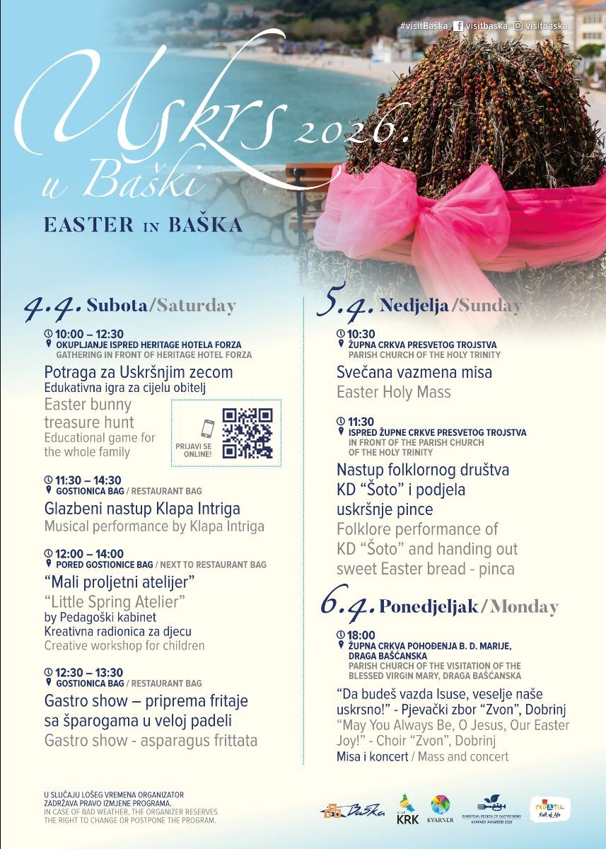 Uz cilj da pronađu "Uskršnjeg zeca" i možda obore prošlogodišnji rekord, djeca i odrasli zajedno istražuju povijest Baške, glagoljašku baštinu i prirodne posebnosti mjesta, stvarajući uspomene koje nadilaze klasične blagdanske aktivnosti. Najuspješnije timove očekuju i simbolične nagrade, a nezaboravne uspomene su zajamčene!
