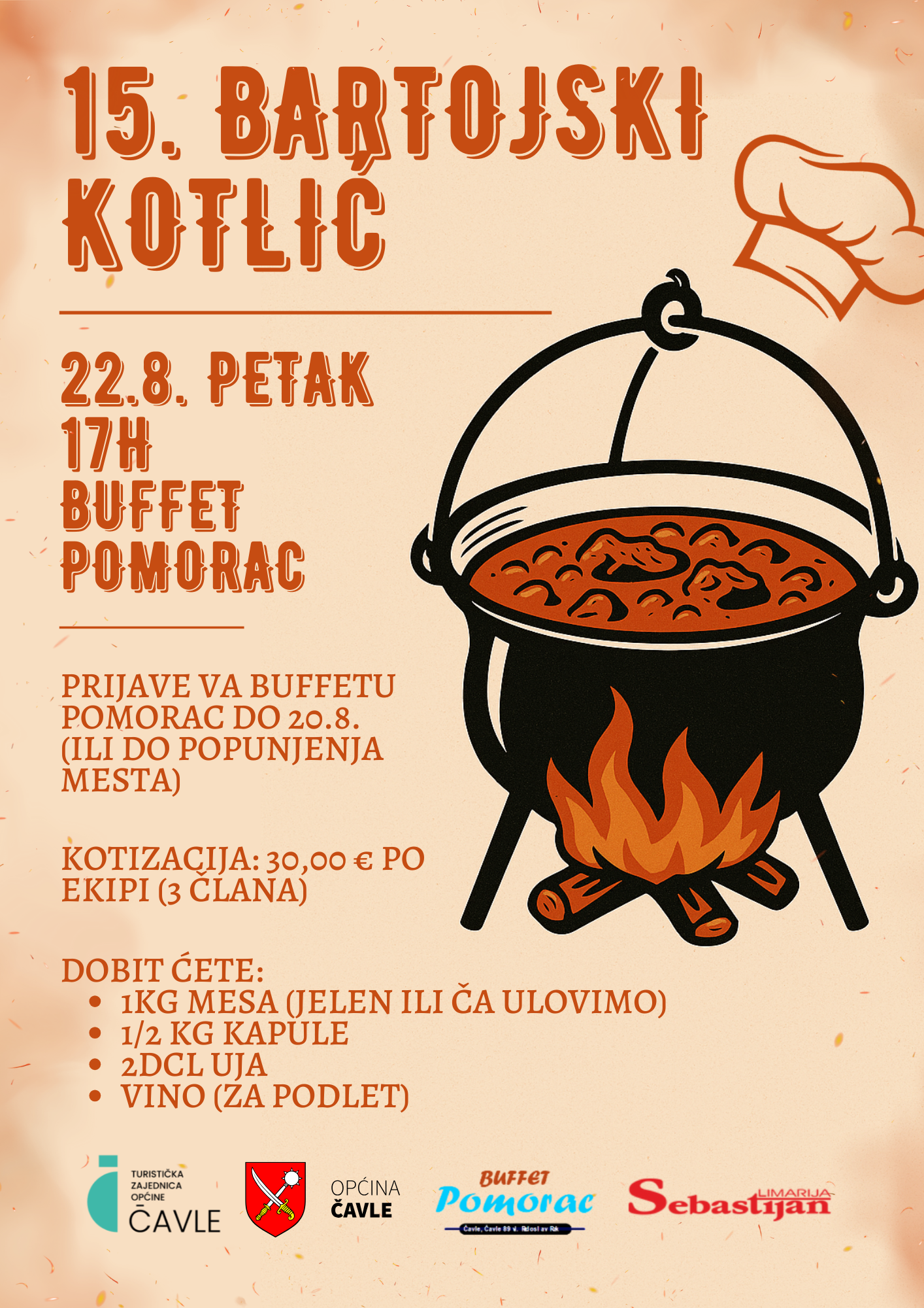 U petak, 22. kolovoza, program se otvara na platou ispred Buffeta Pomorac, gdje će se održati tradicionalni 15. Bartojski kotlić. Ova kulinarska manifestacija okuplja dvadesetak ekipa natjecatelja u nadi pronalaska najboljeg kotlića, a stručni žiri ocjenjuje njihova jela u četiri kategorije: okus safta, kuhanost mesa, okus mesa i izgled gulaša. Uz dobru zabavu i glazbu svi će posjetitelji moći uživati u primamljivim mirisima i zajedničkom druženju, a najbolji će kuhari biti nagrađeni vrijednim nagradama koje je osigurao dugogodišnji sponzor Limarija Sebastijan.