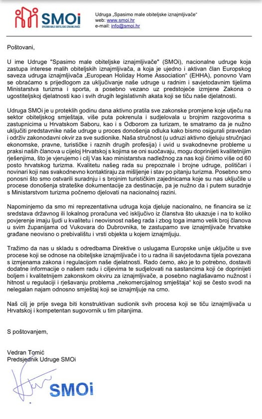Pismo Udruge "Spasimo male obiteljske iznajmljivače" (SMOi