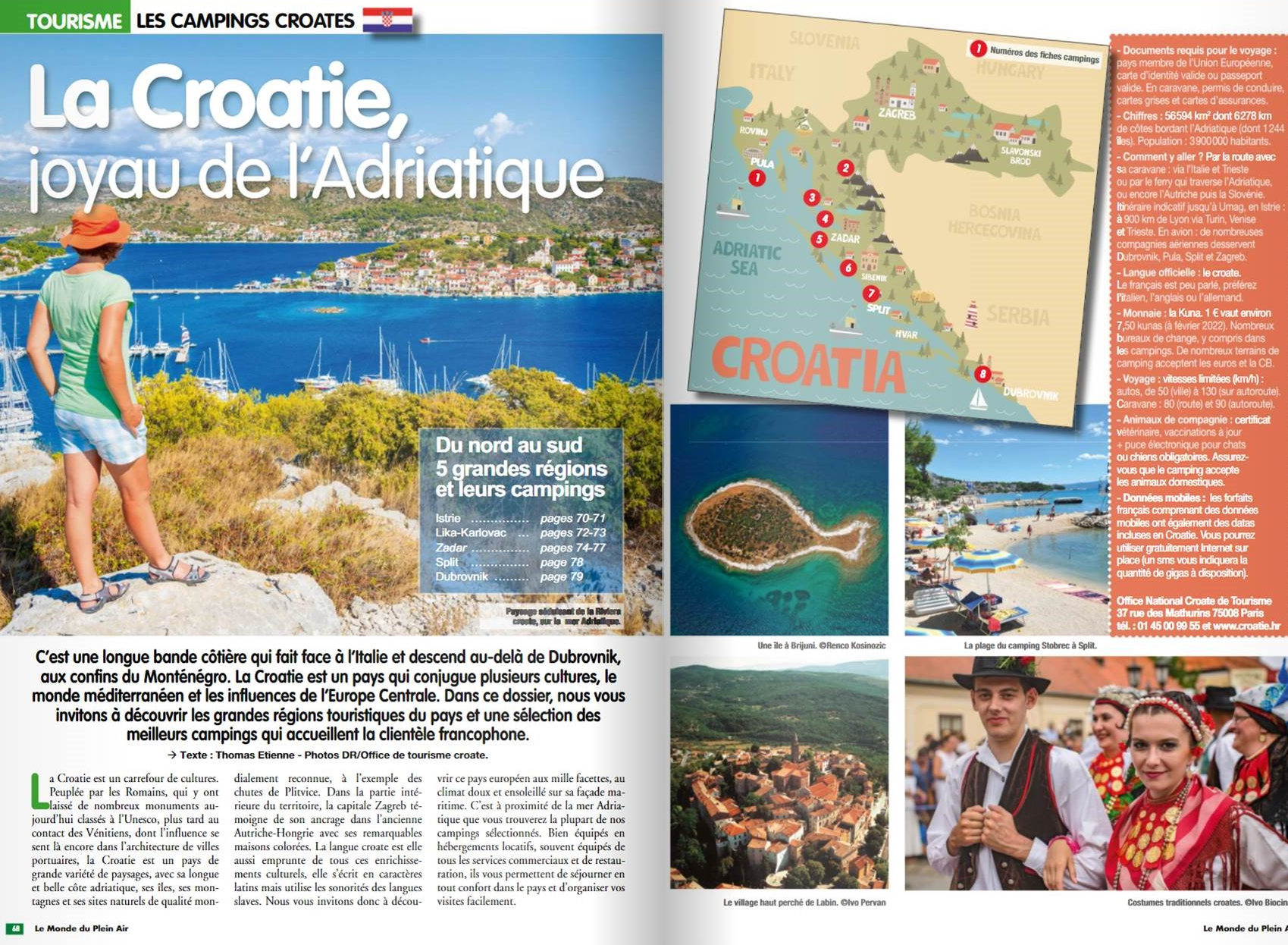 Kampanja je odrađena na 6 dvostrukih stranica prezentacije svih odredišta Hrvatske od Istre do Dubrovnika. Najveći udio u reportaži posvećen je srednjem Jadranu ili točnije destinaaciji i regiji Zadar koja je prisutna kao destinacija sa dvije duplerice i brojnim posebnostima regije u reportažnom prilogu. U kampanji je sudjelovalo 9 hrvatskih kampova koji su po izboru redakcije i brojnošću francuskih gostiju najatraktivnij za francusko tržište.Turistička zajednica Istre je prezentirana sa Camping Arena Grand Kažela, i Top Camping markom, regija Zadar sa Šimunima na otoku Pagu, Holiday Resort Zaton Zadar i kampom Parko Soline Biograd n/m. Regija Split prezentirala se je sa svoja dva najbolja Rožac Trogir( TZ Okrug Gornji) i Stobreč Split dok je regija Dubrovnik zastupljena sa najatraktivnijom ponudom na poluotoku Pelješcu – kampu Nevio Orebić.