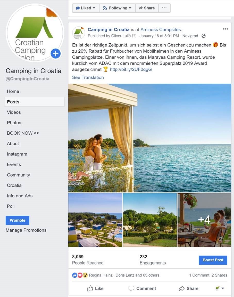 Preko 100 objavljenih postova na engleskom i njemačkom jeziku tijekom protekle godine imalo je za cilj istaknuti brojne prednosti hrvatske kamping ponude općenito, kao i specifičnu ponudu individualnih kampova.