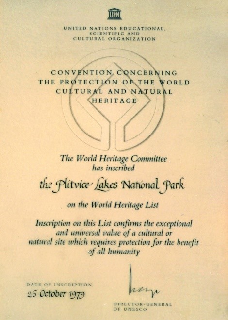 Povelja upisa Nacionalnog parka Plitvička jezera na Popis svjetske baštine