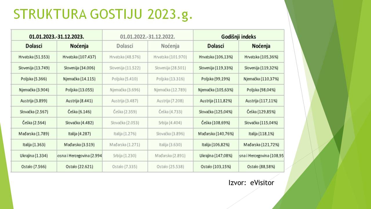 U strukturi gostiju nema promjena u odnosu na ranija razdoblja, te su i dalje najbrojniji su domaći gosti kojih je u 2023.godini bilo 54%, a ostvarili su 48% posto ukupnih noćenja. Slijede gosti iz susjedne Slovenije, zatim Poljske, Njemačke, Austrije itd.