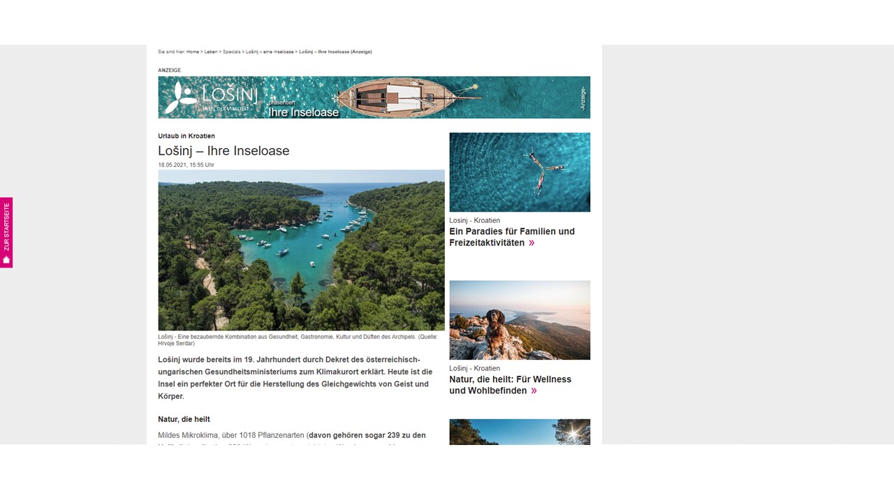 Promotivna kampanja o Lošinju na području četiri emitivne zemlje; Austrija, Njemačka, Italija i Slovenija