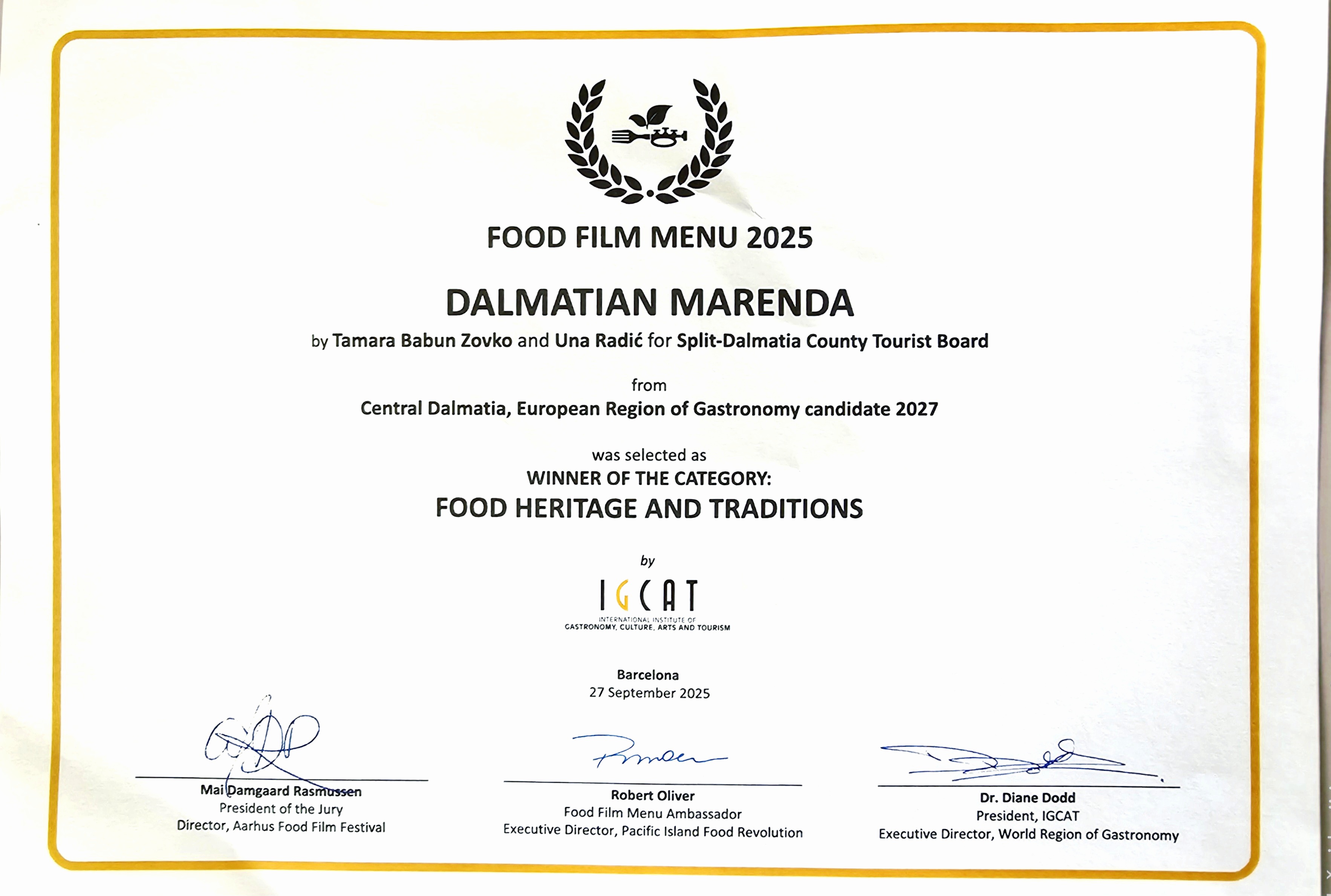 Poseban trenutak za našu županiju bilo je osvajanje prestižne nagrade Food Film Menu za najbolji video u kategoriji „Food Heritage and Tradition“ s promotivnim filmom Dalmatinska marenda. Ovo priznanje snažna je potvrda da autentičnost dalmatinskog načina života, ukorijenjenog u jednostavnosti, druženju i poštovanju prema lokalnim namirnicama, ima univerzalnu vrijednost i prepoznaje se na svjetskoj sceni.