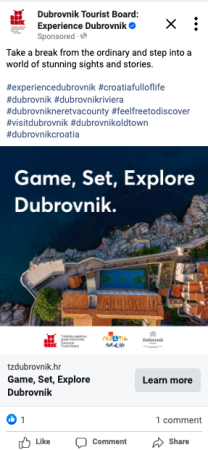 27.01.2025. Turistička zajednica grada Dubrovnika promovirala Dubrovnik na Australian Openu Geotargetirana kampanja na društvenim mrežama ciljano prikazala Dubrovnik kao poželjnu destinaciju